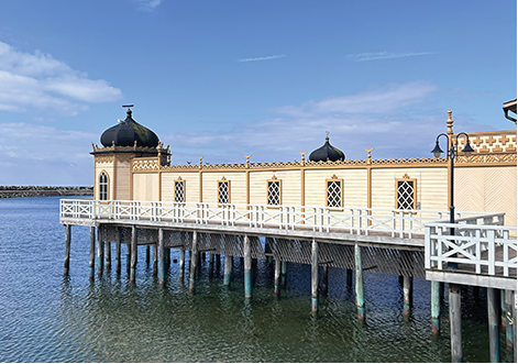 An ornate wooden structure that seems to float on the icy sea, Varberg’s cold bathhouse is a century-old sanctuary of contrast: hot sauna, freezing water, stillness and chatter. Walk out along the jetty from the windswept shoreline and this century-old bathhouse appears like a mirage: golden-hued woodwork, Moorish domes, and waves lapping beneath its stilts.